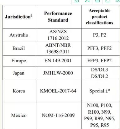 CDC優(yōu)化呼吸器供應(yīng)策略中推薦的NIOSH替代標(biāo)準(zhǔn),除了中國(guó)標(biāo)準(zhǔn):GB 2626-2006外,其他均被EUA采納。