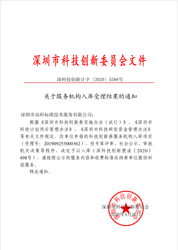 重要通知:我司深圳市訊科標(biāo)準(zhǔn)技術(shù)成科技創(chuàng)新券的服務(wù)機(jī)構(gòu)