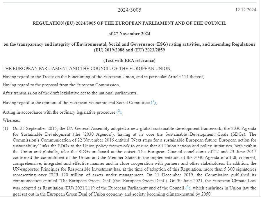 2024年12月12日,歐盟《官方公報(bào)》上正式發(fā)布關(guān)于環(huán)境、社會(huì)和治理(ESG)評(píng)級(jí)活動(dòng)的新法規(guī)[法規(guī)編號(hào)(EU) 2024/3005]。這一新規(guī),對(duì)原有的歐盟法規(guī)(EU) 2019/2088和(EU) 2023/2859做出修訂。這一法規(guī)旨在使歐盟境內(nèi)的ESG評(píng)級(jí)活動(dòng)更加一致、透明并更具可比性。歐盟認(rèn)為,此舉將提升投資者對(duì)可持續(xù)金融產(chǎn)品的信心,并促進(jìn)歐盟內(nèi)部市場(chǎng)的有效運(yùn)作。