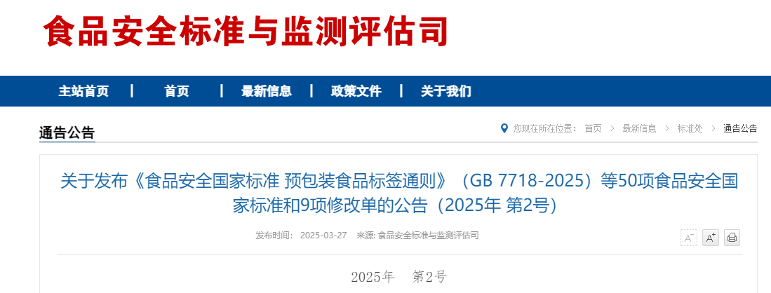 根據《食品安全法》規定,國家衛生健康委、市場監管總局聯合印發2025年第2號公告,發布50項新食品安全國家標準和9項修改單。主要包括:《預包裝食品標簽通則》等2項食品標簽標準、《嬰幼兒谷類輔助食品》等3項特殊膳食食品標準、《發酵乳》等4項食品產品標準、《調制肉制品生產衛生規范》等3項生產經營規范標準、《消毒劑》1項食品相關產品標準、《食品營養強化劑?乙二胺四乙酸鐵鈉》等4項食品營養強化劑質量規格標準、《食品添加劑?葉黃素》等4項食品添加劑質量規格標準、《食品安全國家標準 食品微生物學檢驗 大腸菌群計數》等29項檢驗方法標準,以及《滅菌乳》等9項修改單。