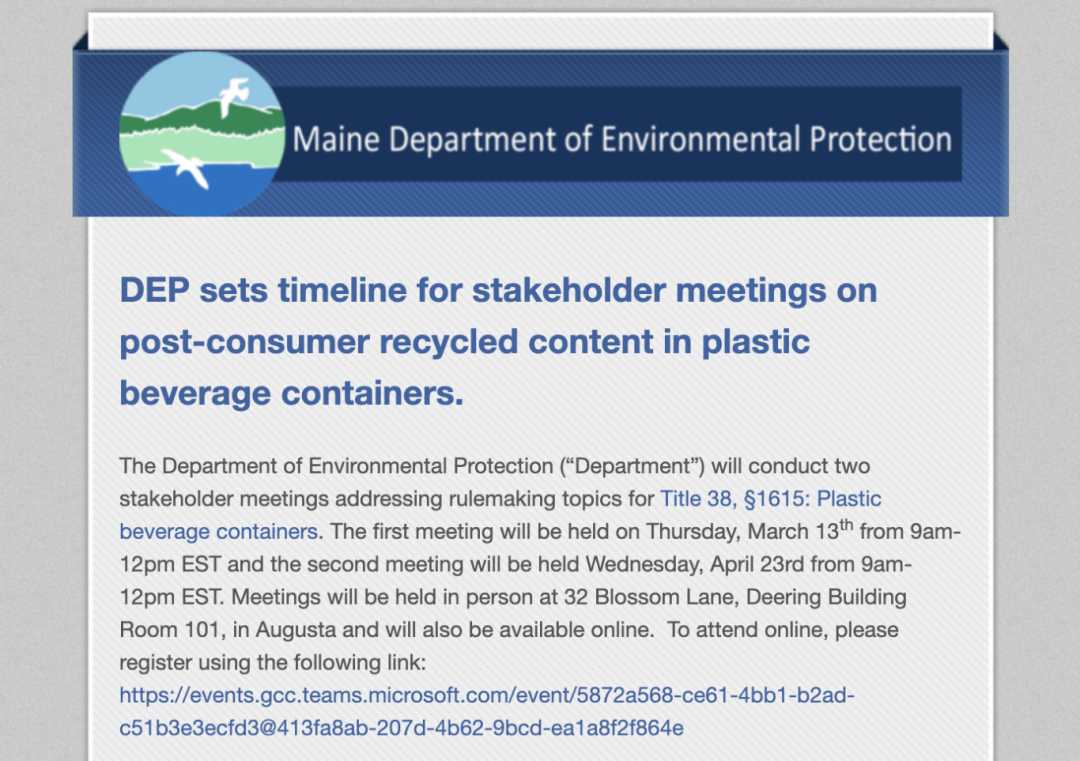 美國(guó)緬因州環(huán)境保護(hù)部將于 2025 年 4 月 23 日舉行一次利益相關(guān)者會(huì)議,就《緬因州法規(guī)第38卷第1615節(jié)》的相關(guān)內(nèi)容進(jìn)行討論。此前,緬因州發(fā)布了一項(xiàng)與回收塑料相關(guān)的法案《緬因州法規(guī)第38卷第1615節(jié)》,該法案旨在通過(guò)分階段提高塑料飲料容器中消費(fèi)后回收材料(PCR)的比例,推動(dòng)該州循環(huán)經(jīng)濟(jì)和可持續(xù)發(fā)展。以下為該法案的主要內(nèi)容。