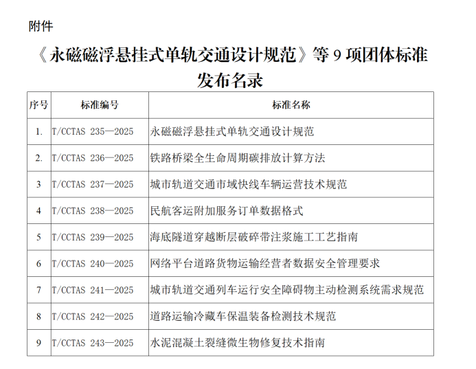 根據(jù)《中國交通運輸協(xié)會團體標準管理辦法》有關規(guī)定,現(xiàn)批準發(fā)布《永磁磁浮懸掛式單軌交通設計規(guī)范》等9項團體標準(見附件),現(xiàn)予公告。