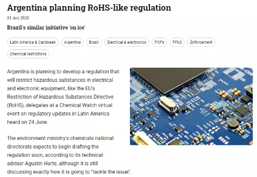 2020年6月24日,阿根廷宣布正在計(jì)劃制定一項(xiàng)限制電子電氣設(shè)備中有害物質(zhì)的法規(guī), 類似于歐盟的RoHS。根據(jù)技術(shù)專家的意見,當(dāng)局近期或?qū)㈤_始起草此法規(guī)。