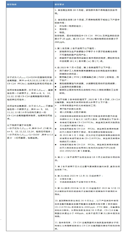 2020年8月3日,歐盟向WTO提交通報 G/ TBT/ N/EU/ 731,擬在歐盟REACH法規((EC) No 1907/2006)附錄XVII中限制C9-C14 PFCAs。該法規草案正接受公眾咨詢,咨詢期為通報發出后60天。該法規預計于2021年一季度被采納,在歐盟官方公報上發布20天后生效。相關限制要求于法規生效18個月后實施。