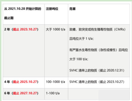 然后根據化學品危害和噸位的不同,在2021年10月28日之后的2,4或6年內補充完整注冊信息。