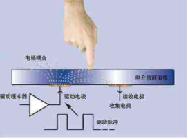 當(dāng)手指觸摸在金屬層上時(shí),由于人體電場(chǎng),用戶和觸摸屏表面形成以一個(gè)耦合電容,對(duì)于高頻電流來說,電容是直接導(dǎo)體,于是手指從接觸點(diǎn)吸走一個(gè)很小的電流。這個(gè)電流分別從觸摸屏的四角上的電極中流出,并且流經(jīng)這四個(gè)電極的電流與手指到四角的距離成正比,控制器通過對(duì)這四個(gè)電流比例的精確計(jì)算,得出觸摸點(diǎn)的位置。