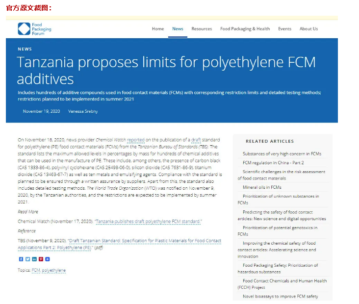 2020年11月18日,據化學觀察報道,坦桑尼亞標準局(TBS)發布食品接觸材料(FCMs)聚乙烯(PE)標準草案。
