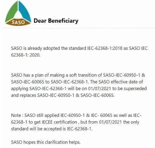 近期,沙特阿拉伯標(biāo)準(zhǔn)化組織(SASO)已宣布采用新的SASO-IEC 62368-1:2020(IEC 62368-1:2018 3.0版)標(biāo)準(zhǔn)。自2021年7月1日起,對于音頻/視頻、信息和通信技術(shù)設(shè)備,沙特SASO將僅接受SASO-IEC 62368-1:2020用于申請SASO IECEE(SIRC)證書和SABER合格機(jī)構(gòu)認(rèn)證(CoC),不再接受基于SASO-IEC 60950-1和SASO-IEC 60065標(biāo)準(zhǔn)的申請。