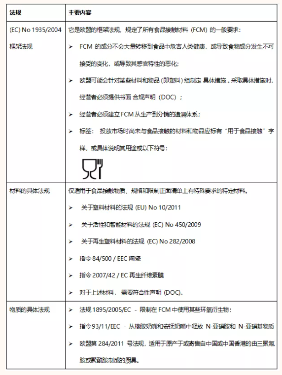 食品接觸材料的產品出口歐盟,不僅要滿足歐盟法規要求,出口到具體的歐盟成員國還需滿足成員國對食品接觸材料的特殊的法律法規要求。對于粘合劑,紙張,不銹鋼等歐盟沒有法規要求,可按歐盟成員國自己的要求和政府間組織-歐洲委員會(CoE)的要求。