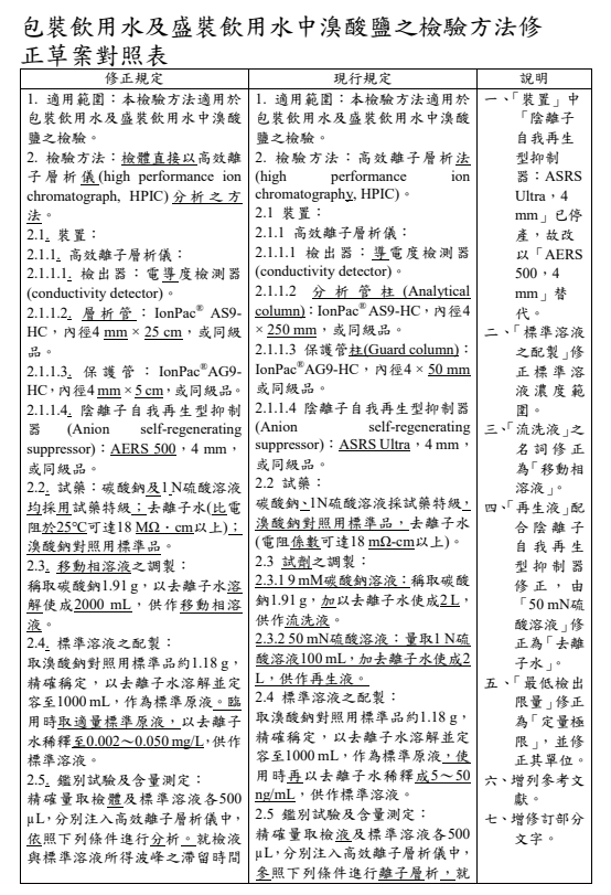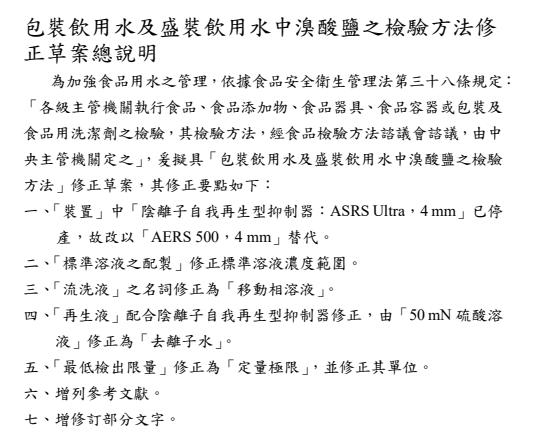 2022年5月23日,臺灣衛福部食藥署發布衛授食字第1111900735號公告,預告修正「包裝飲用水及盛裝飲用水中溴酸鹽之檢驗方法」草案。 其修正要點如下: